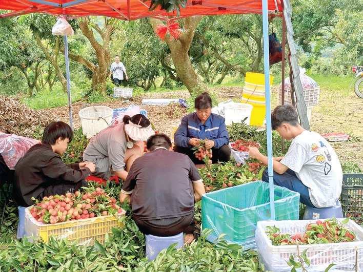 目前,这里种植的桂味、糯米糍和仙进奉正火热销售,尤其是新品种仙进奉和冰荔,凭借果肉厚实、甜度出众的特点,获得市场的一致好评。每天,他请来10多名工人采摘、分拣、打包和发货,通过冷链物流将荔枝销往全国各地。在工人们忙碌的身影旁,一群土鸡在果树下悠闲地散步,在草丛中欢快地啄虫。黄律达说,“果园+林下养殖”生态循环模式不仅减少了化肥和农药的使用,还带来额外收入,也提高了果实和鸡肉的品质。