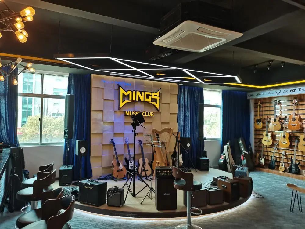 (铭仕乐器企业内,陈列着来自多国一线品牌吉他产品)