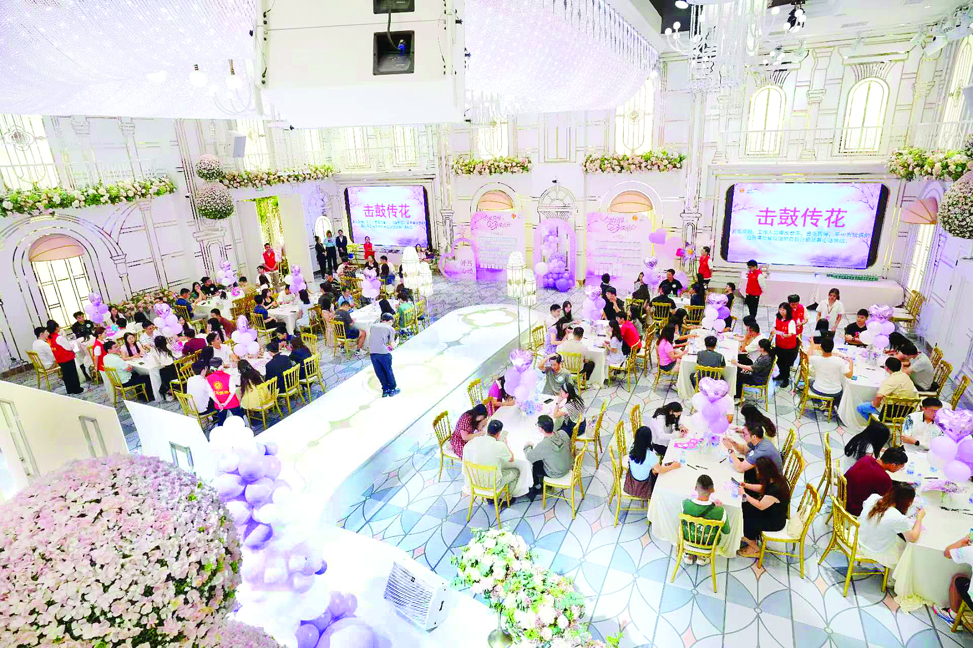 现场以鲜花和气球精心装点,处处洋溢着浪漫气息。在独具特色的“桃花签”签到墙前,嘉宾们留下专属印记,悬挂的个人资料卡如朵朵桃花绽放缘分的可能。