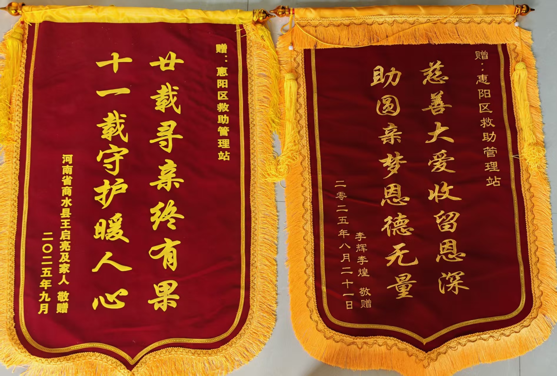 近日,惠阳区救助管理站收到了两份来自河南与湖北的特别“礼物”——两面书写着深深谢意的锦旗。锦旗上,“廿载寻亲终有果,十一载守护暖人心”“慈善大爱收留恩深,助圆亲梦恩德无量”的金色大字,不仅传递着受助者家属沉甸甸的感激,也无声诉说着该站历时多年,成功帮助两名失联二十余载的受助人员重返家园的动人故事,深刻践行了民政工作“以民为本、为民解困”的服务宗旨。